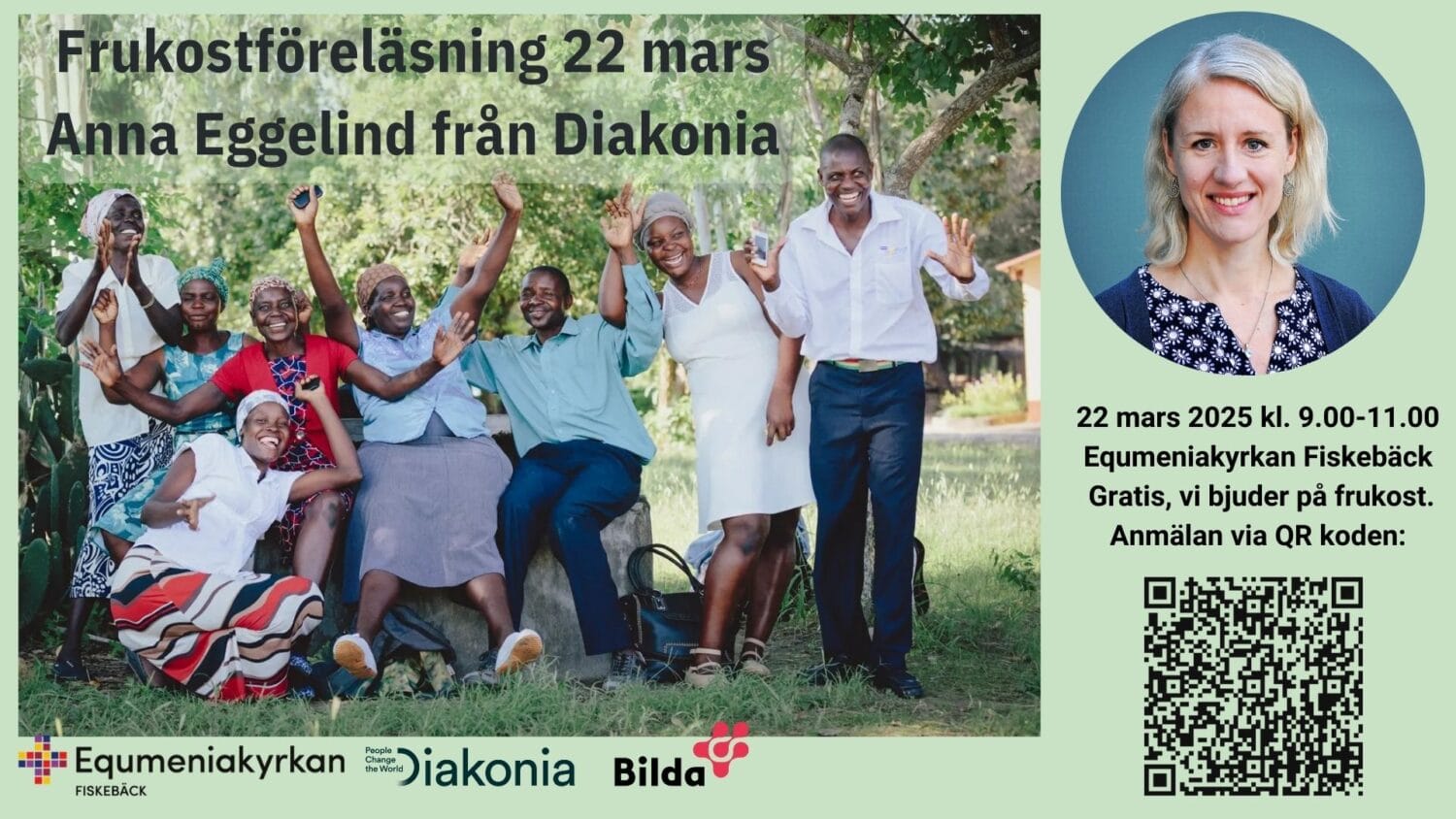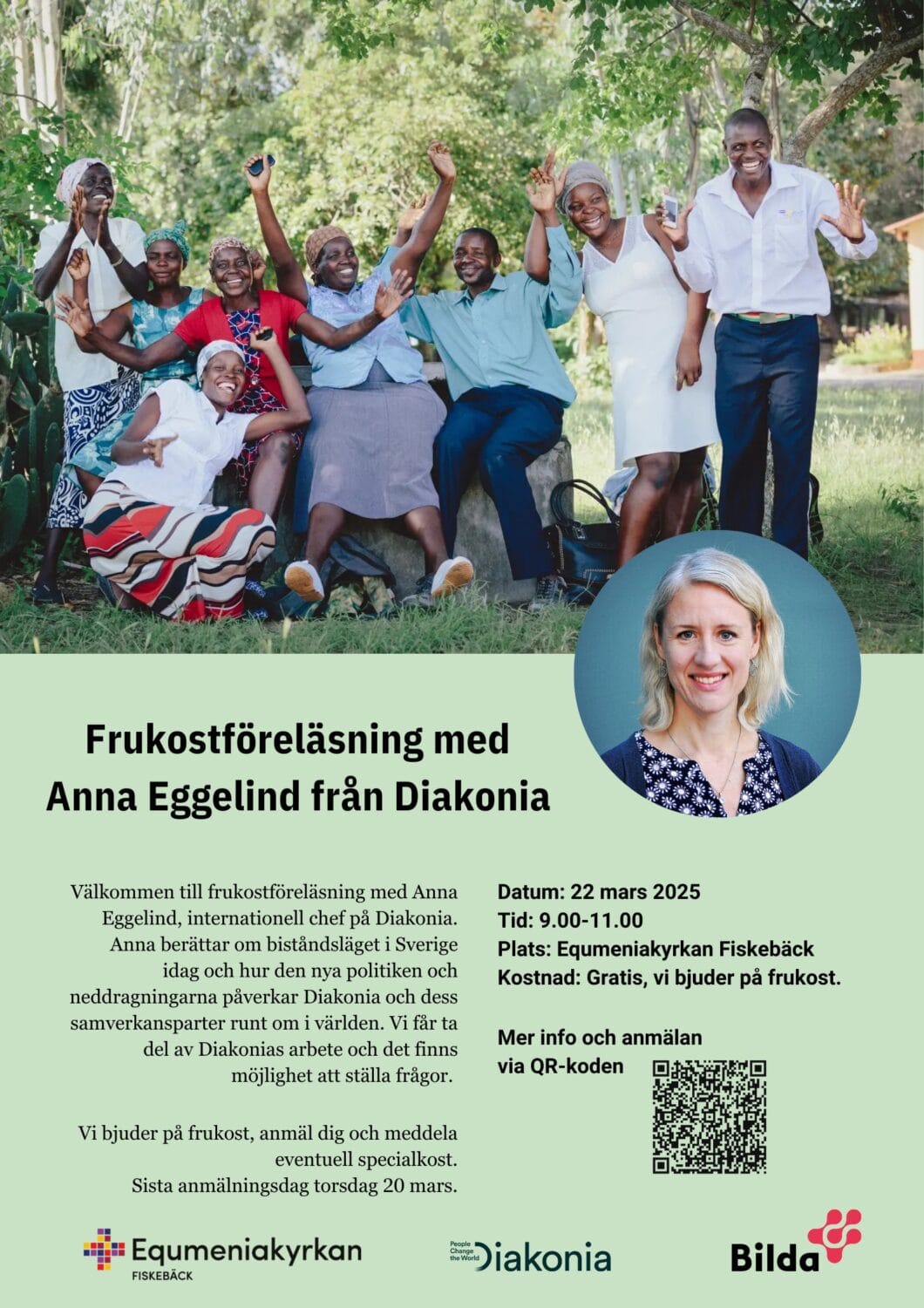 Välkommen till frukostföreläsning med Anna Eggelind, internationell chef på Diakonia. Anna berättar om biståndsläget i Sverige idag och hur den nya politiken och neddragningarna påverkar Diakonia och dess samverkansparter runt om i världen. Vi får ta del av Diakonias arbete och det finns möjlighet att ställa frågor.