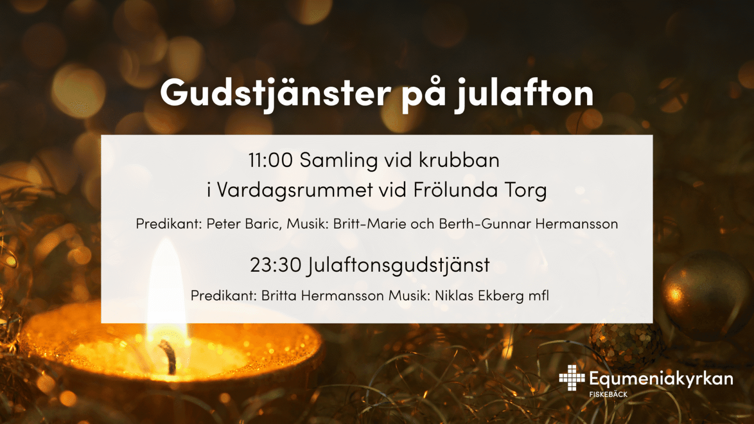 i kyrksalen, Equmeniakyrkan Fiskebäck. Predikant: Elin Karlman, Barn- och familjepastor i Pingstkyrkan Västra Frölunda. Gudstjänstledare: Peter Baric. Musik: Niklas Ekberg med flera.