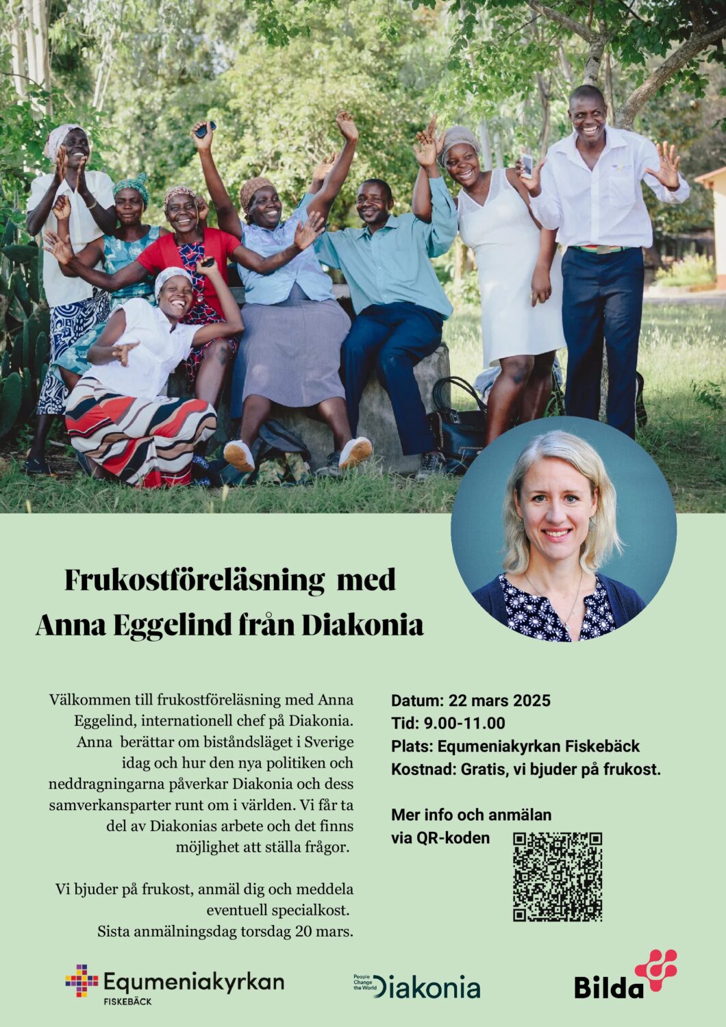 Bilda och Globala rådet i Equmeniakyrkan Fiskebäck bjuder vi in till frukostföreläsning med Anna Eggelind, internationell chef på Diakonia. Anna berättar om biståndsläget i Sverige idag och hur den nya politiken och neddragningarna påverkar Diakonia och dess samverkansparter runt om i världen. Vi får ta del av Diakonias arbete och det finns möjlighet att ställa frågor.