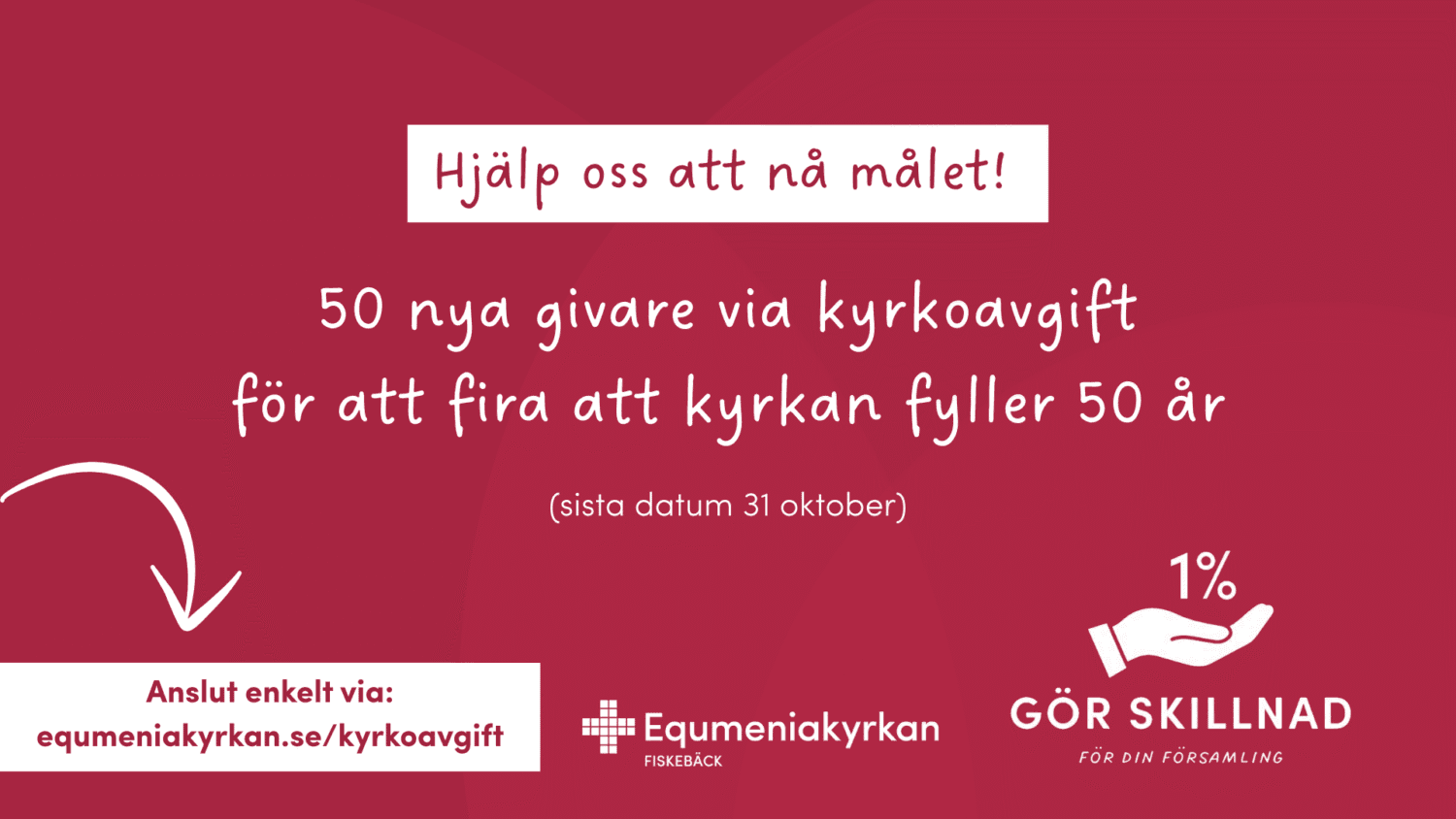 Våra församlingslokaler invigdes i Allhelgonahelgen 1975. Det kommer vi att fira under hösten, bland annat under församlingsdagen den 6 september. För att bygga församlingens verksamhet stark inför ytterligare 50 år har vi satt upp ett mål: Innan den 31 oktober hoppas vi på 50 nya givare av kyrkoavgift till Equmeniakyrkan Fiskebäck!