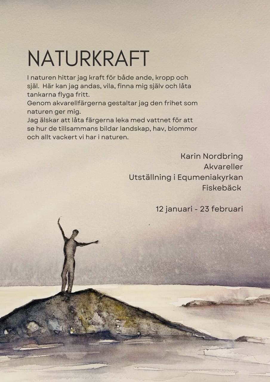 Konstutställning i akvarell av Karin Nordbring som förgyller vårt kyrktorg 12 januari till 23 februari.