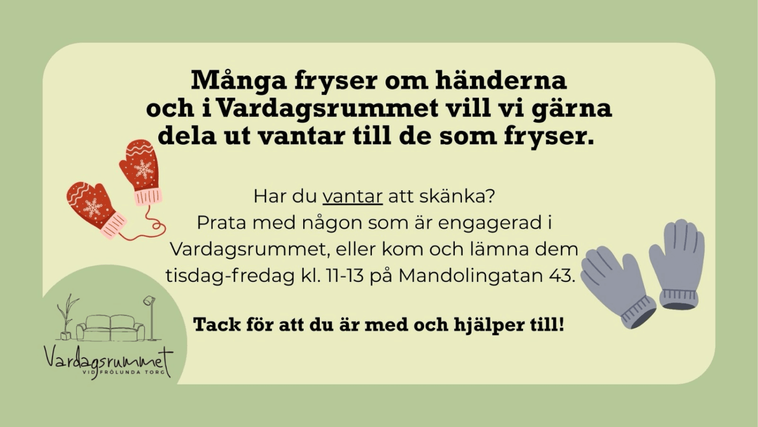 Vintern har varit extra lång och kall i år. I Vardagsrummet på Frölunda torg möter vi många som fryser i kylan. Därför vill vi gärna dela ut vantar till behövande. Har du möjlighet att skänka till vår utdelning?