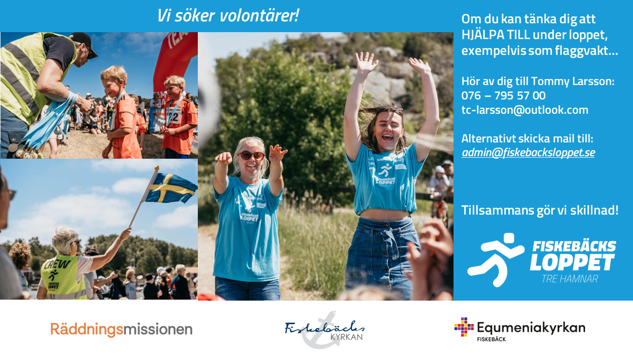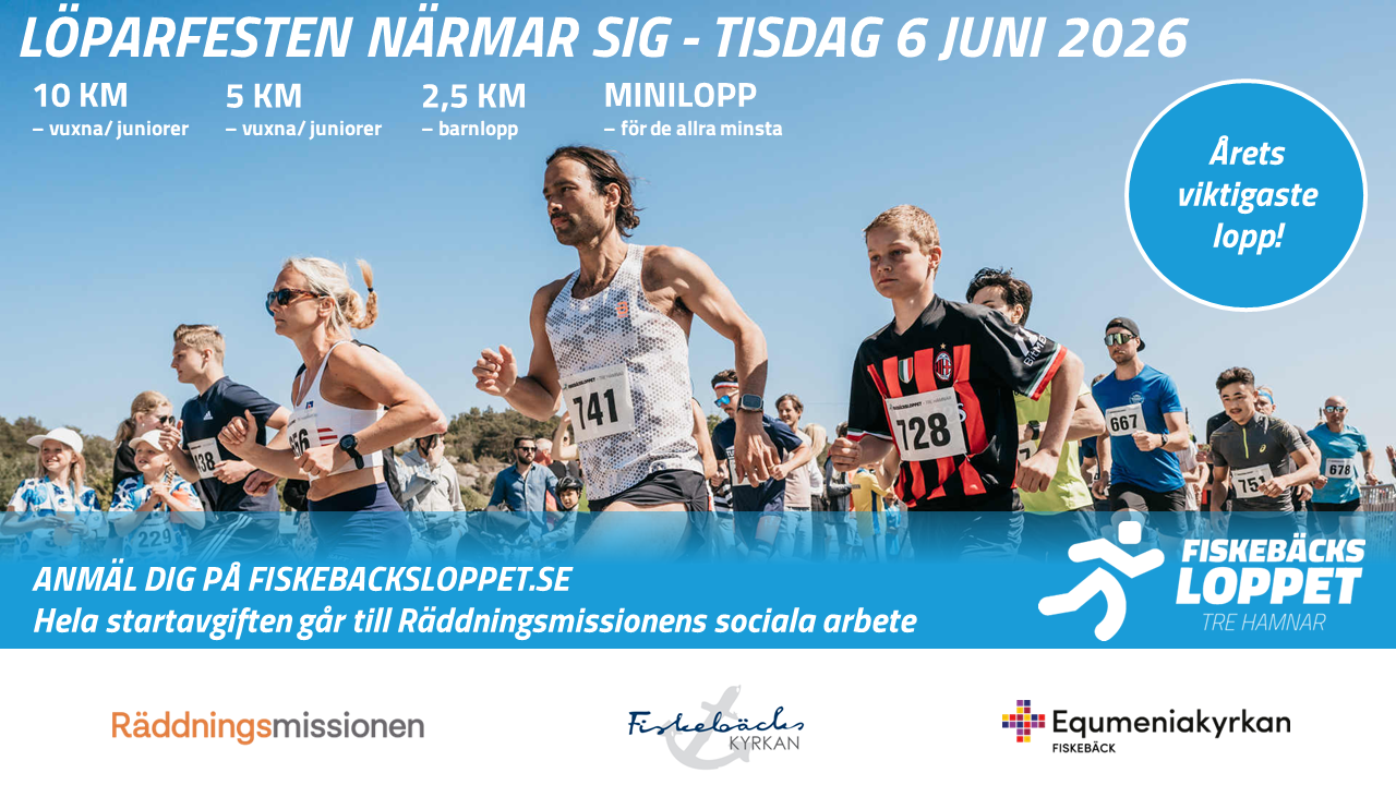 Den 6 juni är det dags igen för Fiskebäcksloppet – Tre Hamnar. Under loppet kommer du att passera genom tre hamnar och få njuta av vacker natur, men det finaste med loppet är att du inte bara springer för dig själv utan också för andra. Genom att springa Fiskebäcksloppet hjälper du människor i utsatthet då din startavgift går till Räddningsmissionens sociala arbete.