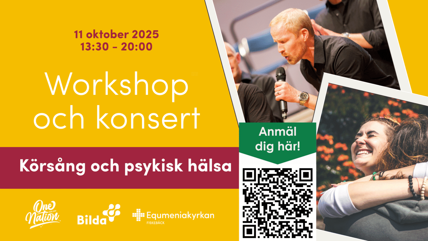 Välkommen till en eftermiddag med körworkshop och konsert kring körsång och psykisk hälsa. Musiken är vårt första och sista språk. Den får oss att tappa andan och hämta andan, landa och lyfta. Vi är många som kan berätta om hur sånger har burit oss när det har varit som tyngst.